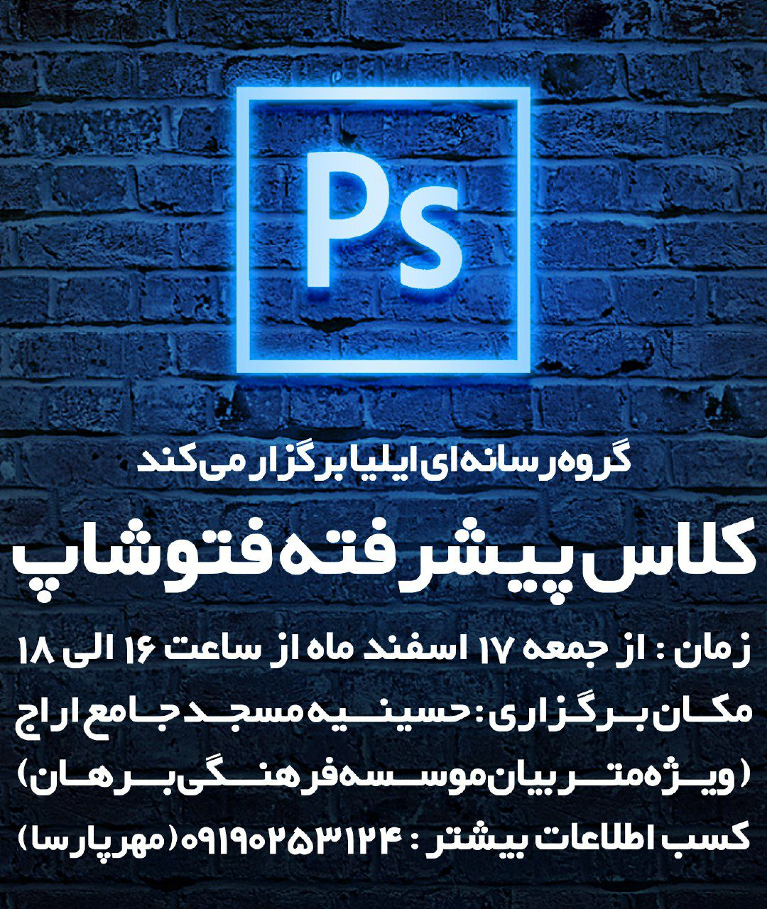 📌 شروع کلاس #فتوشاپ_پیشرفته🕓 زمان: جمعه ها ساعت ۱۶ الی ۱۸📍مکان:حسینیه مسجد جامع اراج🔸ویژه #متربیان موسسه فرهنگی برهان🔹جهت کسب اطلاعات بیشتر ۰۹۱۹۰۲۵۳۱۲۴ (مهر پارسا)