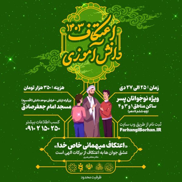 📣 سومین سال خاص ترین اعتکاف دانش آموزیBorhanدسامبر 22, 2024📣 سومین سال خاص ترین اعتکاف دانش آموزی ⬅️ ویژه پسران متوسطه اول و دومساکن منطقه ١ ، ٣ ، ... ادامه مطلب